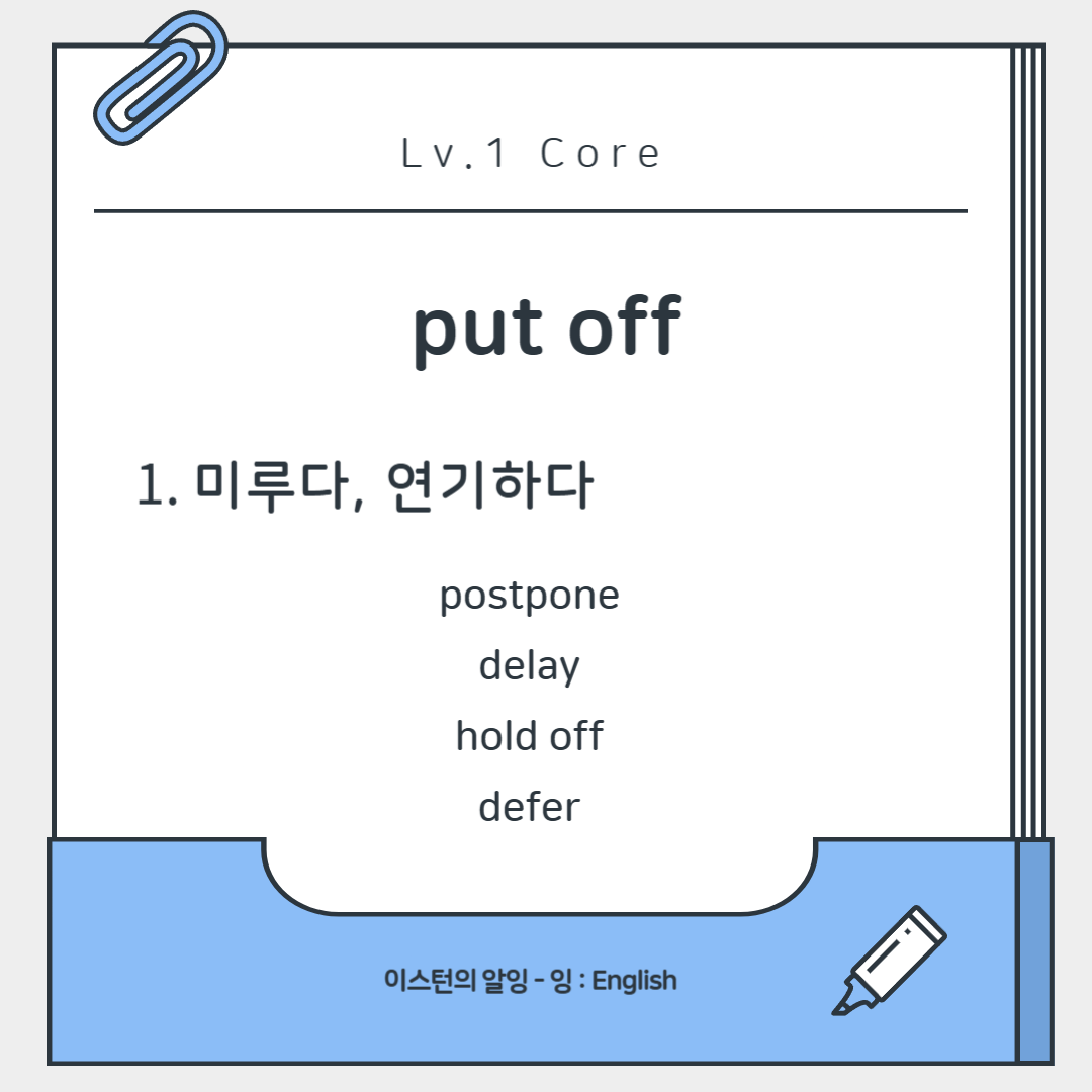 put off는 일정·계획·약속 등을 ‘연기하다, 미루다’라는 의미로, 일상 대화와 업무 상황 모두에서 자주 쓰이는 실전 필수 구동사입니다.
