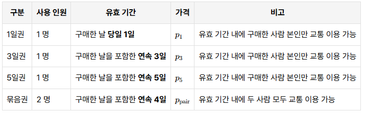 부산광역시에서 판매하는 4종류의 교통 티켓을 활용해, 두 사람의 N일간 관광 일정에 필요한 최소 비용을 구하는 문제입니다. 본 글에서는 문제 요약, 접근 아이디어, C++ 구현 코드를 단계별로 설명합니다.