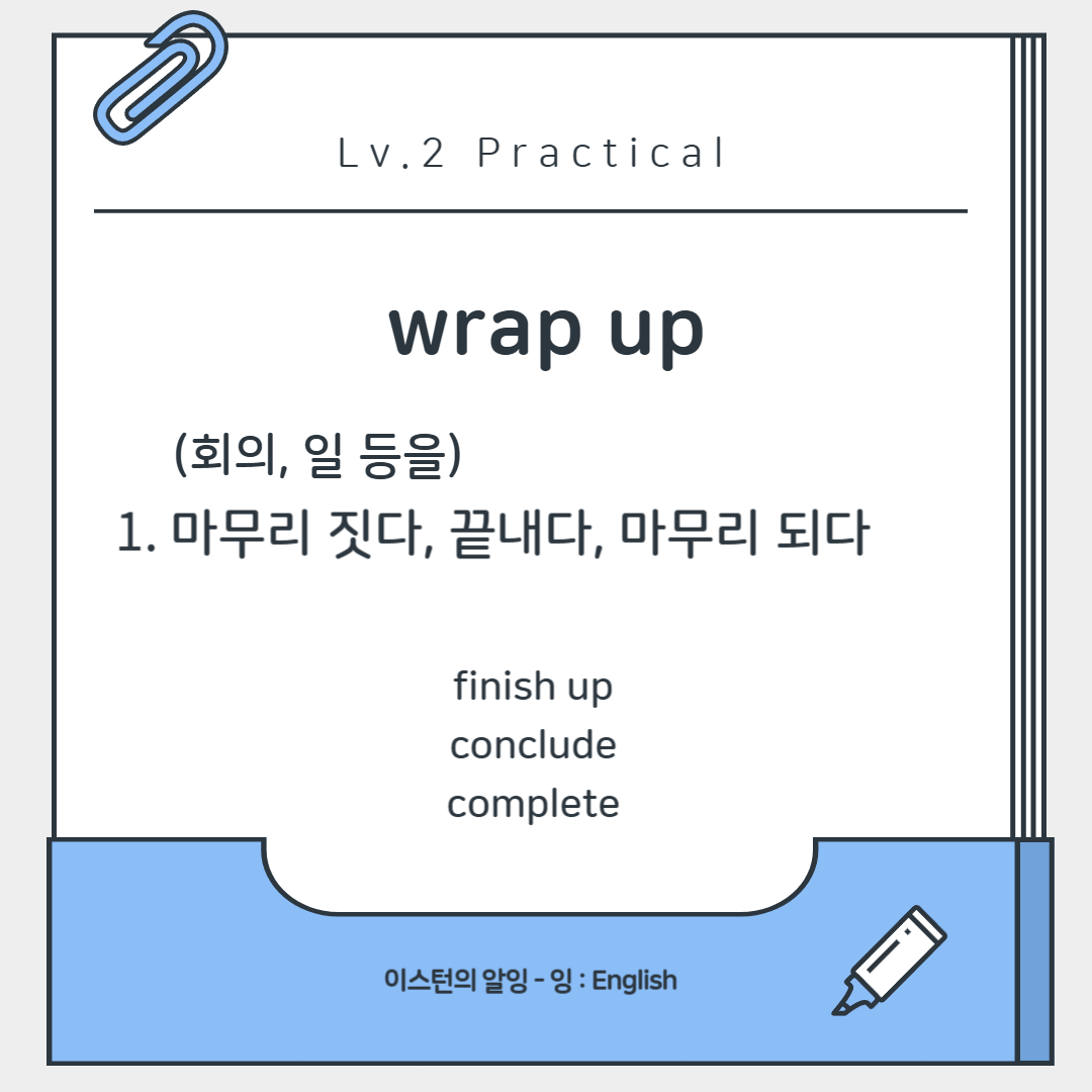 wrap up은 회화뿐 아니라 업무나 비즈니스 환경에서도 자주 사용되는 구동사로,어떤 일이나 활동을 정리하고 마무리 짓는 과정을 자연스럽고 전문적으로 표현할 때 쓰입니다.