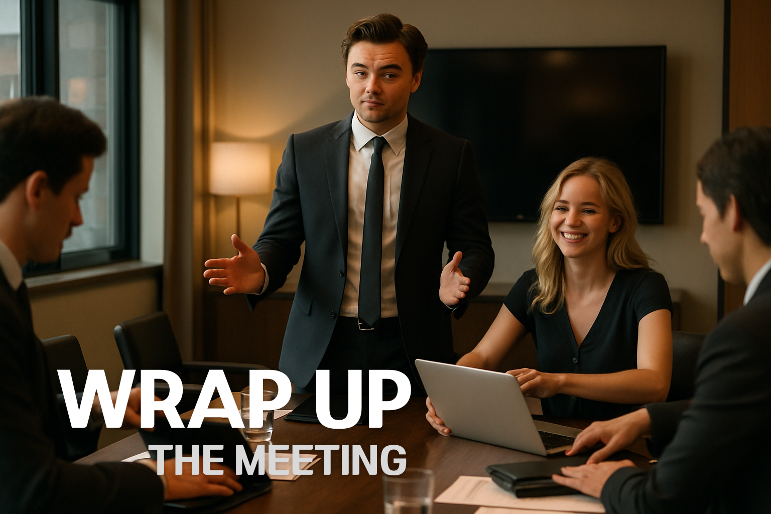 Meaning: to bring something to an end in an organized or satisfying way, especially a meeting, task, or project